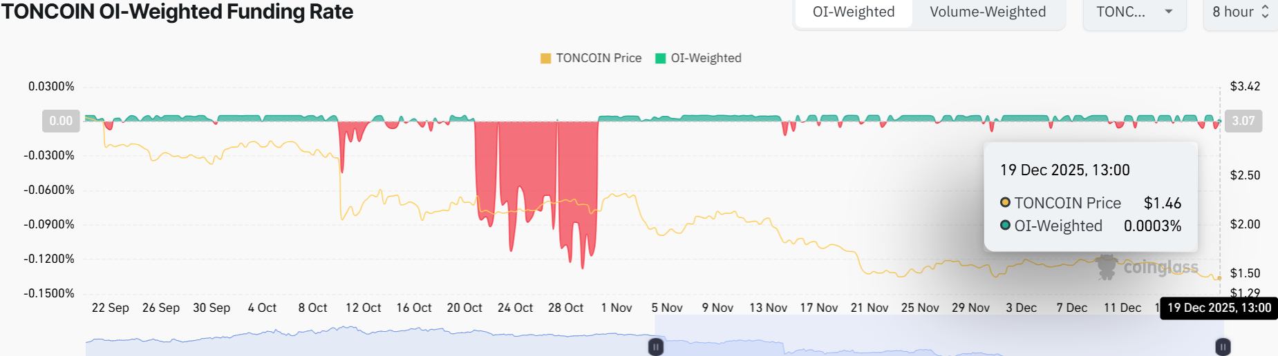 Toncoin has dropped almost to the negative according to the derivatives data. The OI-Weighted Funding Rate data presented by Coinglass reveals that there are more traders who are betting that the price of TON will fall further than those who are betting that the price of Toncoin will go up.