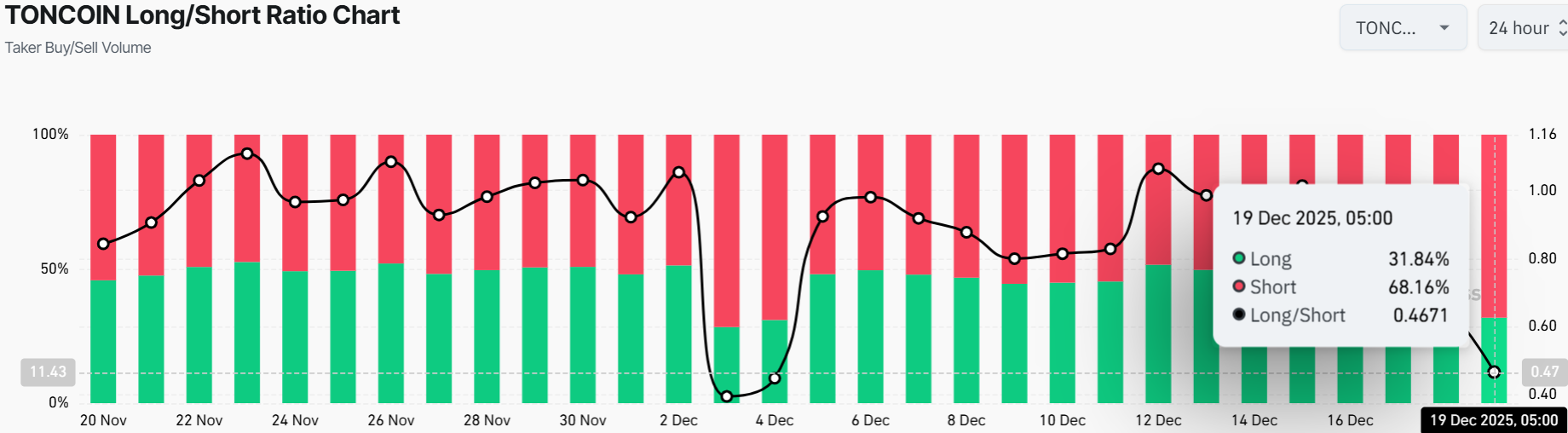 The metric is currently at 0.0003% implying that longs are paying shorts. Besides, the long-short ratio of TON is 0.46. A ratio of less than one is a sign of increased bearishness, with the traders placing their bets on the depreciation of the asset price.
