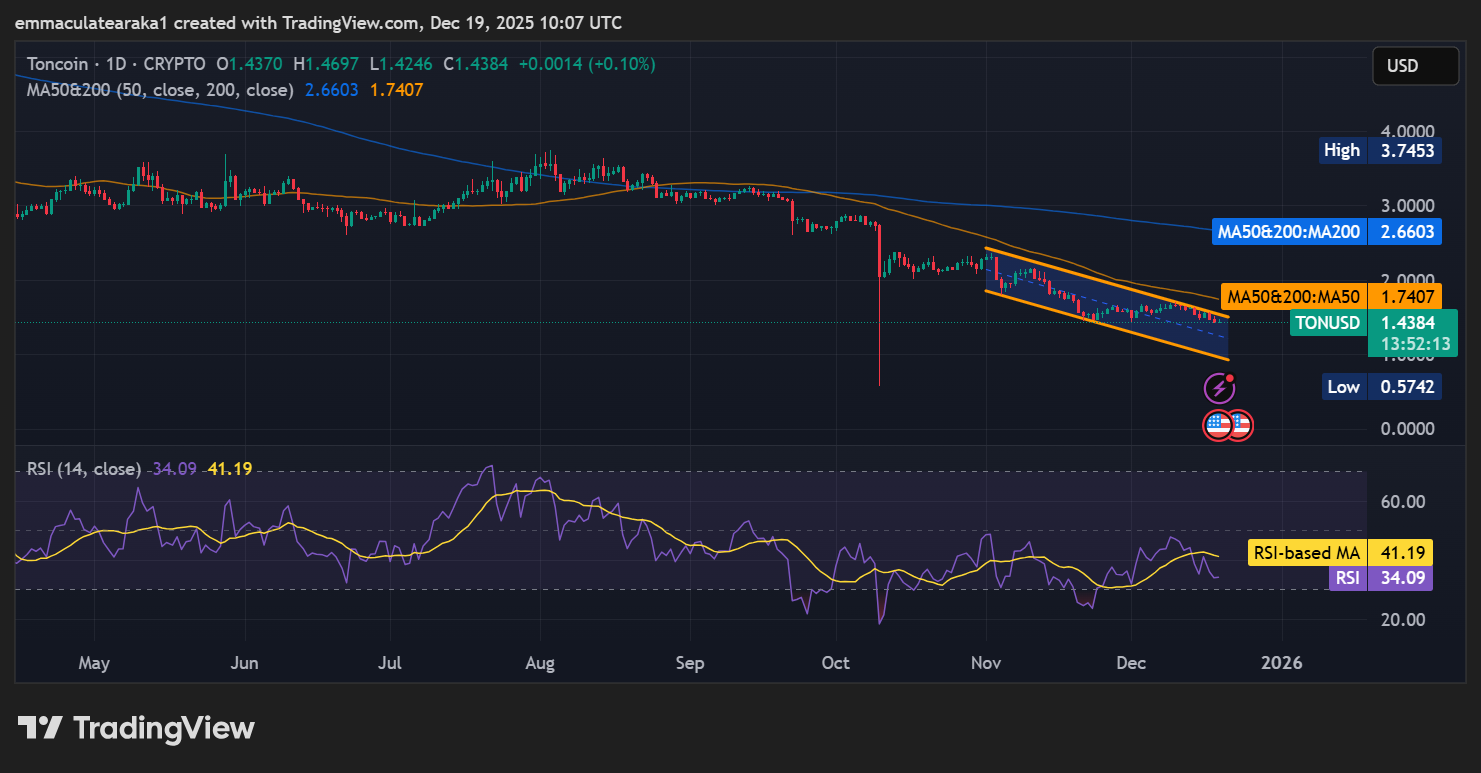The Toncoin price is now trading at $1.44, below the 50-day simple moving average (SMA) at $1.74 and the 200-day SMA at $2.66. Bears are in control as the coin struggles to hold above the critical $1.42 support zone. The 50-day SMA at $1.74 has become strong resistance after the recent breakdown. The 200-day SMA is acting as the long-term resistance for the bulls at $2.66, suggesting a great tussle ahead for the bulls.