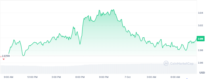 XRP is trading around $2.99 with a modest gain of 0.70% over the past 24 hours. The recent price rally has seen its weekly and monthly gains climb to 3% and 6%, respectively. Furthermore, its market cap and trading volume have risen to $179 billion and $6.29 billion, respectively.