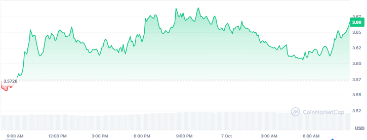 SUI has been on a steady ride recently, with its price surging by over 12% on the weekly chart. As of this writing, SUI is trading at $3.66 with a market capitalization of $13 billion. Additionally, its trading volume has increased by 10% to $1.14 billion.