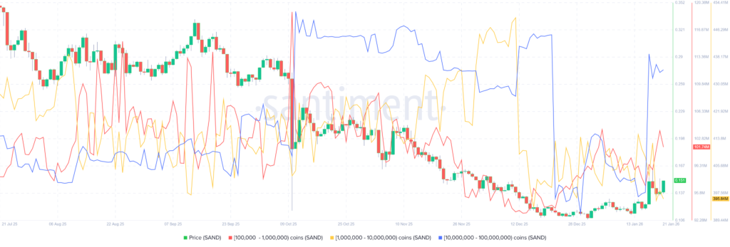 The Supply Distribution data provided by Santiment demonstrates interesting insights regarding whale activity in The Sandbox’s market. Between January 15 and Thursday, whales with 10 million to 100 million SAND tokens (drawn by the blue line) and 100,000 to 1 million SAND tokens (drawn by the red line) received a total of 94.39 million SAND tokens.