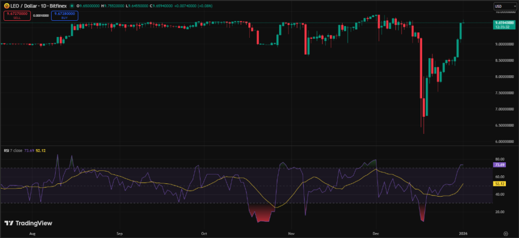 - LEO is pressing toward $10 after breaking out of consolidation, signaling strong hands still holding firm.