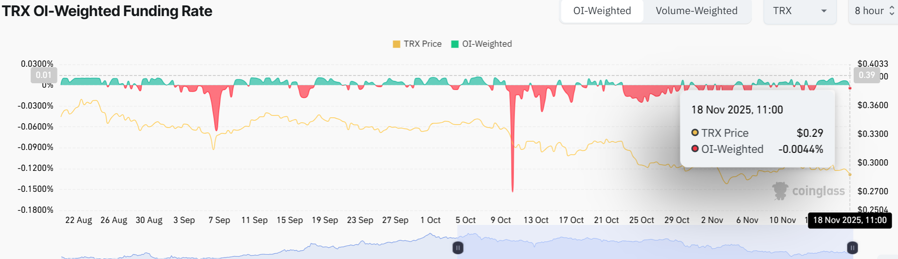 Tron derivatives data have a negative sentiment, further reinforcing the bearish thesis.. The data of the OI-Weighted Funding Rate provided by Coinglass indicates that the number of traders who bet that the price of TRX will fall is greater than those who expect the price to rise.