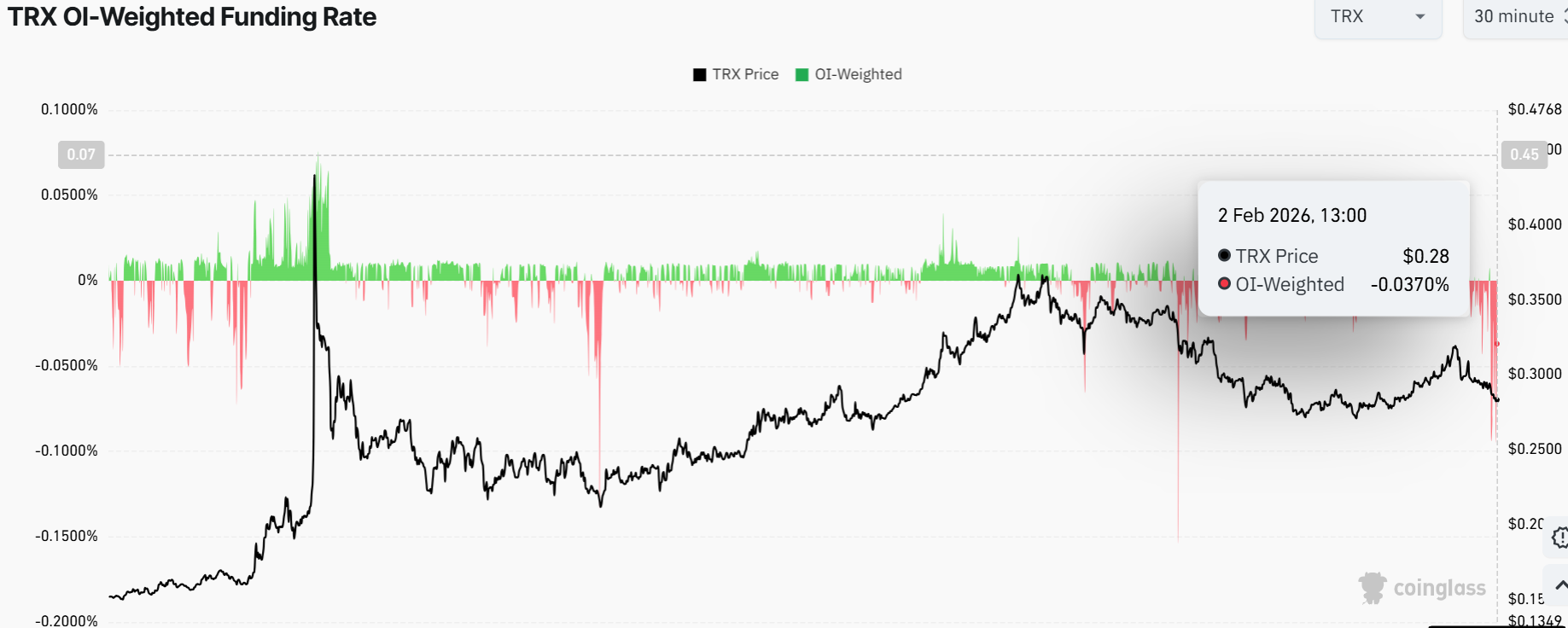 Tron (TRX) price is in the red, as it has slipped 1% to trade at $0.28 mark. Its daily trading volume has also plunged about 2.8% to $26 billion, indicating a drop in market activity. Meanwhile, Tron Inc., which used to be called SRM Entertainment Inc, bought about 175,000 TRX tokens on Monday, which is indicative of the buy-the-dip strategy. Nevertheless, larger market forces are moving risk-off among the altcoin investors, as TRX risks further drop to $0.27 lows amid negative funding rates.