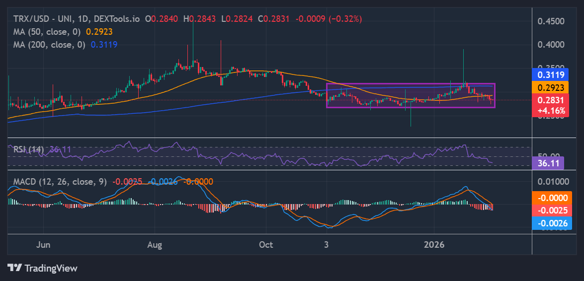Technically, the TRX price action has been very choppy after sliding for the fifth consecutive day. The daily chart shows price currently at $0.28, down nearly 1% over the past 24 hours and sitting under both the 50-day Simple Moving Average (SMA) at $0.29 and the 200-day SMA at $0.31.