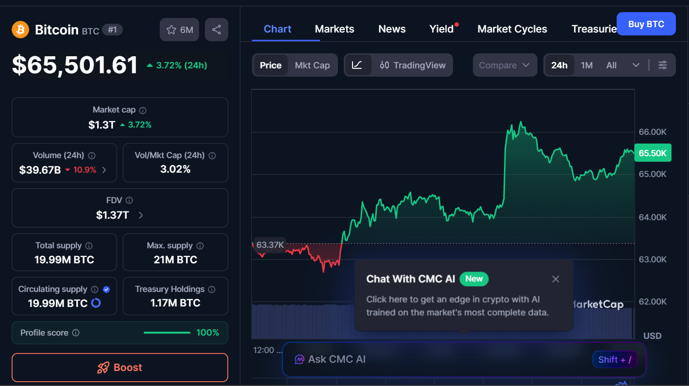 The crypto market has reacted positively after the State of the Union Address. Bitcoin is trading above $65,000 after a brief decline below that zone. The coin is trading at $65,501, a 3.72% increase in the past day. The market cap has also reclaimed the $1.3 trillion mark.