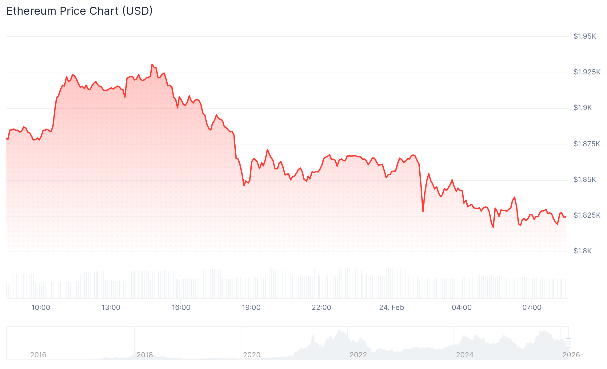 Within the same timeframe, Ethereum has dropped by 2.9%, changing hands at about $1,824 with a market cap of $220.04 billion and a trading volume of $20.9 billion. In the past week, month, and year, Ethereum has declined by 7.9%, 38%, and 33.2%, respectively.