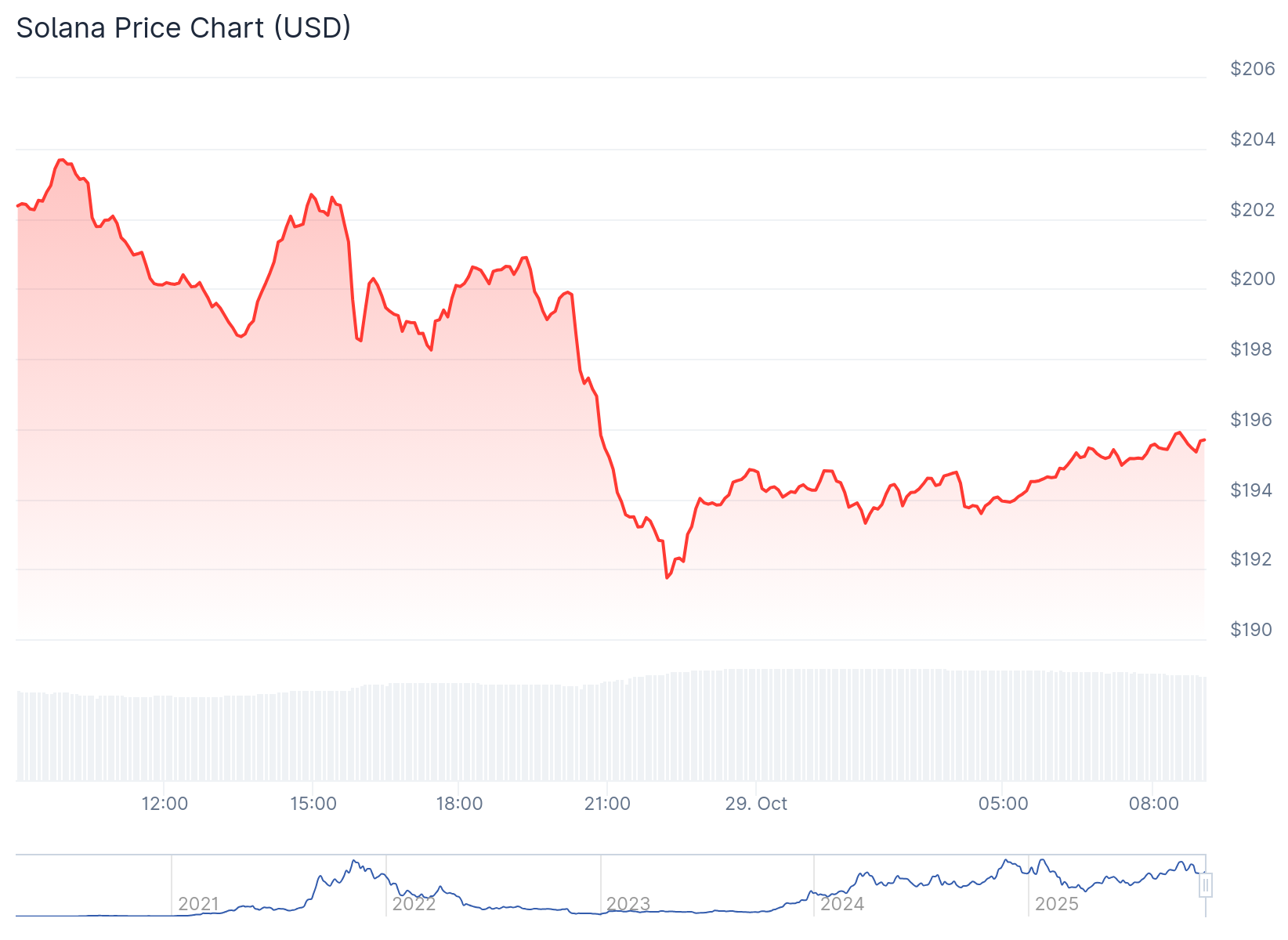 At the time of writing, Solana is trading at $195.58, following a 2.5% decline in the past 24 hours. It fluctuated between $191.75 and $203.68 with a trading volume of about $7.7 billion. Its 7-day-to-date price change variable reflected a 5.3% upswing. However, SOL is 6.9% down month-to-date. Solana’s supply inflation and volatility remain high at 17.31% and 8.26%, respectively.
