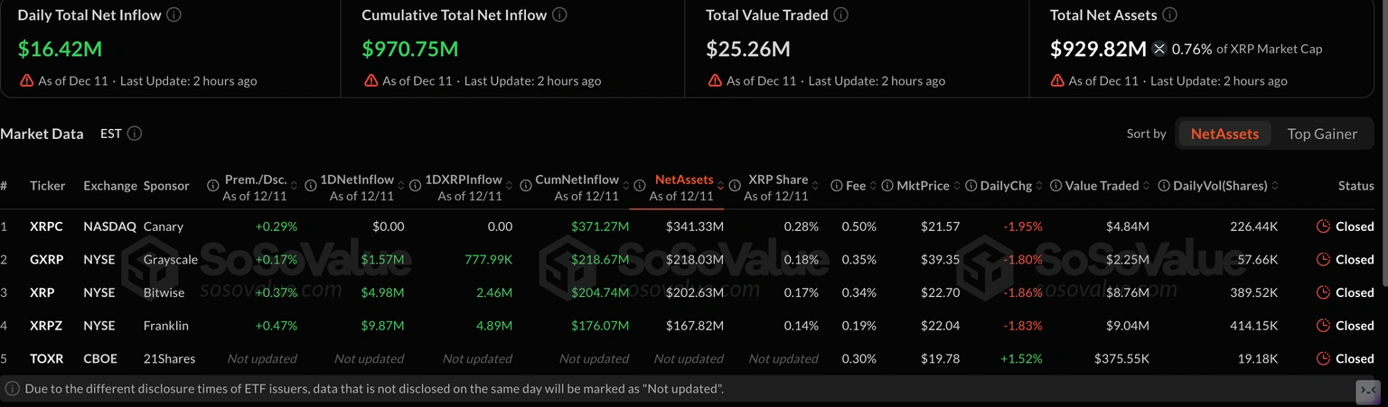 The demand for XRP Exchange Traded Funds (ETFs) is stable, as the inflows amount to about $16 million on Thursday. As the data provided by SoSoValue shows, the cumulative amount of the inflow has already reached $971 million, and it is soon approaching the mark of $1 billion mark. However, XRP ETFs contain net assets of $930 million.