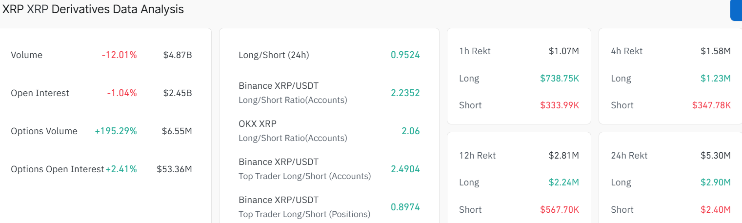 In the meantime, the derivatives market of XRP is poor, characterised by futures Open Interest (OI), which had stabilised at $2.45 billion on Tuesday, marking a 1.04% drop. The stability of the derivatives market indicates that investors are retaining their open positions in the market, and a gradual growth would cast a positive perspective on XRP as investors are moving towards risk-taking.