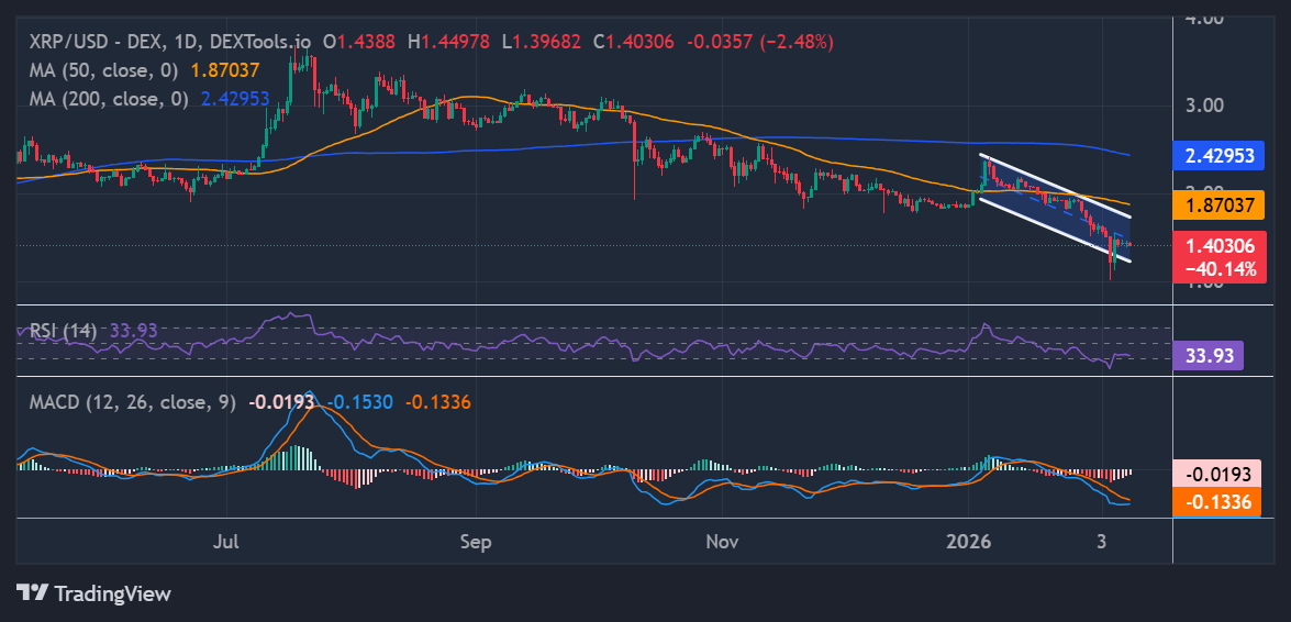 On the daily chart, XRP/USD is trading just under the $1.87 mark. Sitting on a horizontal support zone around $1.20-$1.11 that has been tested multiple times in the past few weeks. The 50‑day simple moving average (SMA) is sloping down above the price near $1.87. Notably, the 200‑day SMA is higher, close to $2.42. This outlook shows that the short‑term trend is under pressure, as the XRP price sits within a falling parallel pattern.