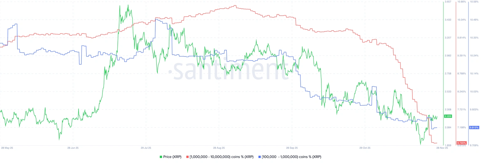Notably, the whales are selling an increasing amount of XRP, which further reinforces the downward pressure on the XRP price. The Supply Distribution measure below indicates that the number of investors owning 100,000-1 million tokens (blue line) now holds 9.81% of the total supply. This is compared to 10.06% on November 1 and 10.21% on September 4.