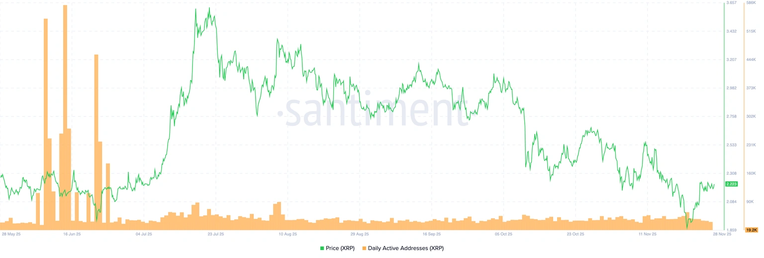 In the meantime, activity on the XRP Ledger (XRPL) has been highly stagnant in terms of on-chain activity in recent months. The Santiment data shows that the number of active addresses on the network per day has not exceeded 100,000 since June. According to Santiment data, the Daily Active Addresses indicate that approximately 19,200 addresses were recording transactions on the XRPL on Thursday, which was around 581,000 in mid-June. The low on-chain activity negatively impacts adoption and user engagement, making it difficult to sustain price rises.