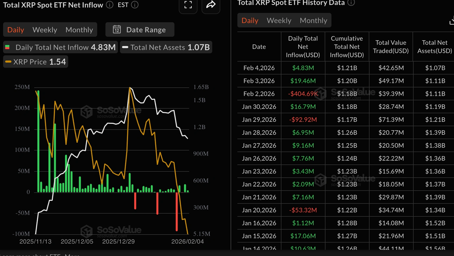 In the meantime, XRP spot Exchange-Traded Funds (ETFs) demand fell on Wednesday, and inflows of almost $5 million were recorded. Mild as it was, this was a second day of inflows after an approximate of $19 million that was posted on Tuesday. The cumulative inflow is at the moment, $1.21 billion and the assets under management are also at 1.07 billion.