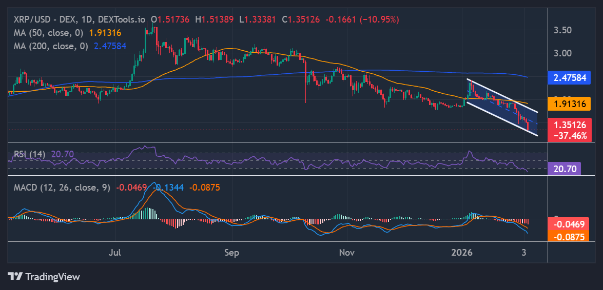 A quick look at the XRP/USD daily price action has been very choppy, as the whole crypto market faces an intense sell-off. The daily chart shows the price is currently at $1.35, down nearly 28% over the past seven days. The altcoin is also sitting under both the 50-day Simple Moving Average (SMA) at $1.91 and the 200-day SMA at $2.47, which are both crucial reference points for long-term traders.