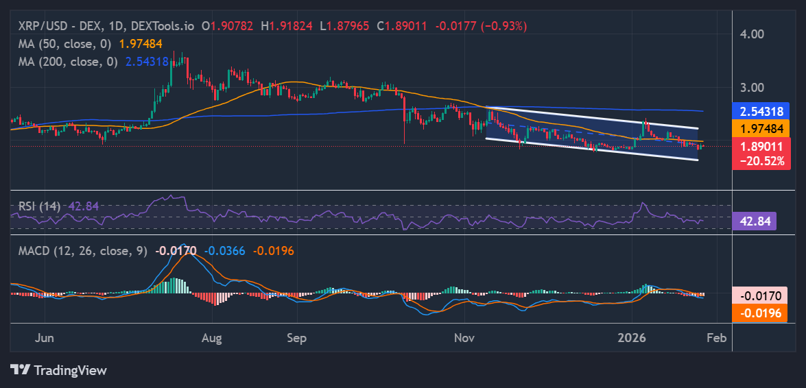 The XRP price stalls below $2.00, currently exchanging hands at $1.88. The altcoin has been falling within a descending channel, with lower highs and lower lows. The 50‑day simple moving average is now falling near $1.97, while the 200‑day simple moving average hovers close to $2.54. XRP is trading below both SMAs, showing that the bears are having the upper hand. There have been several bounces, indicating that many long‑term holders view the current area as a value zone. However, a clean daily close below $1.82 would signal a deeper bearish phase.