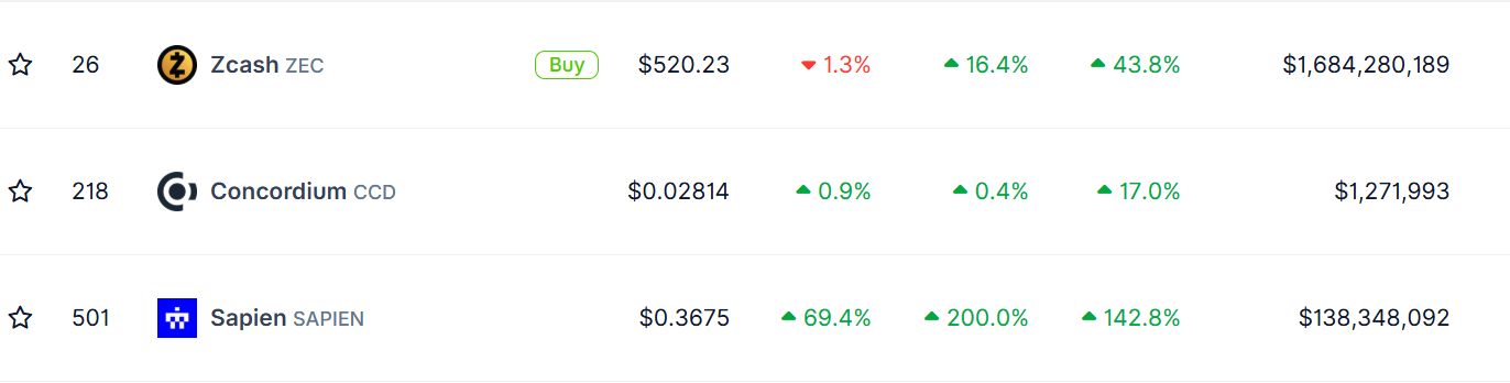 The Zcash price has broken out above $500 mark, gaining a spot among the top trending coins today at $520. This rally marks 15% gains in the past 24 hours, despite its daily trading volume dropping 11%. The market capitalization of the privacy-oriented cryptocurrency has exceeded that of popular altcoins such as Sui (SUI) and Hedera (HBAR). Zcash has increased by over 40% in the past week and is approaching the $600 mark. According to Gecko data, ZEC’s market capitalization has risen to the 26th position in the overall crypto market.