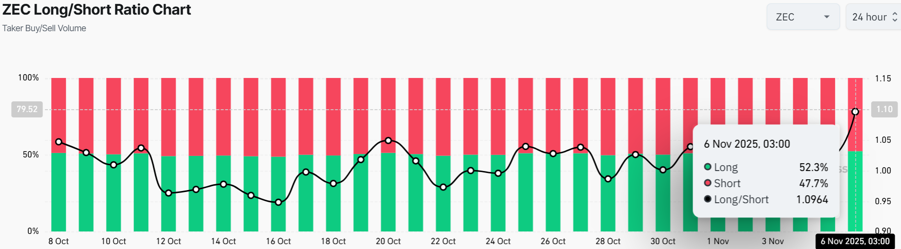 Looking at the bigger picture, ZEC’s recent 15% pump indicates strong bullish sentiment, with the bulls in the driver’s seat. The $523 high is the next psychological barrier. If broken, the Zcash price could ignite a FOMO frenzy. However, if bears claw back, support at $479 could act as the safety net.