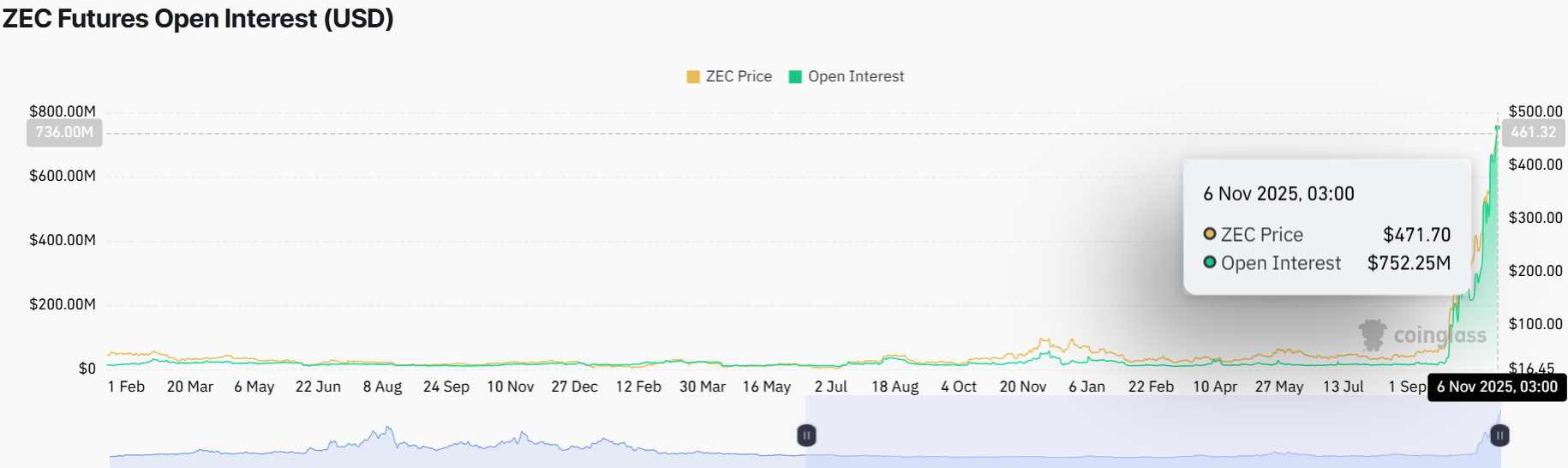 Nevertheless, analyzing its derivatives data indicates a positive outlook for Zcash, and it is likely to rise further. According to CoinGlass, data indicates that ZEC futures OI at exchanges recorded a new all-time high of $773.84 million on Thursday. The emergence of new money in the market and fresh purchases can drive rising OI and contribute to the ongoing price boom in ZEC.