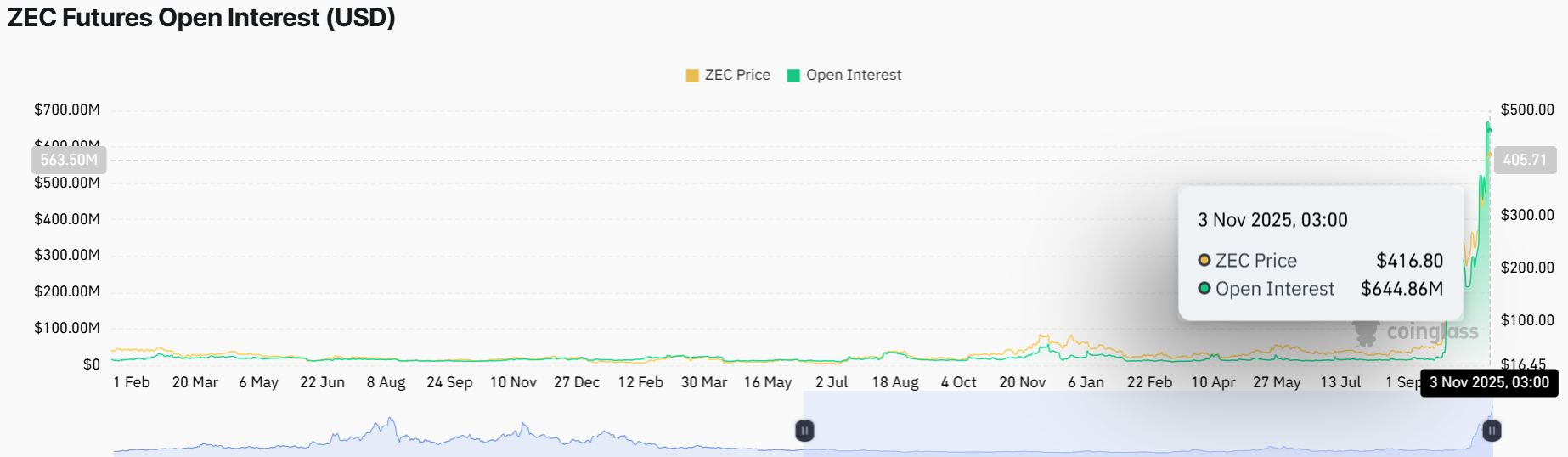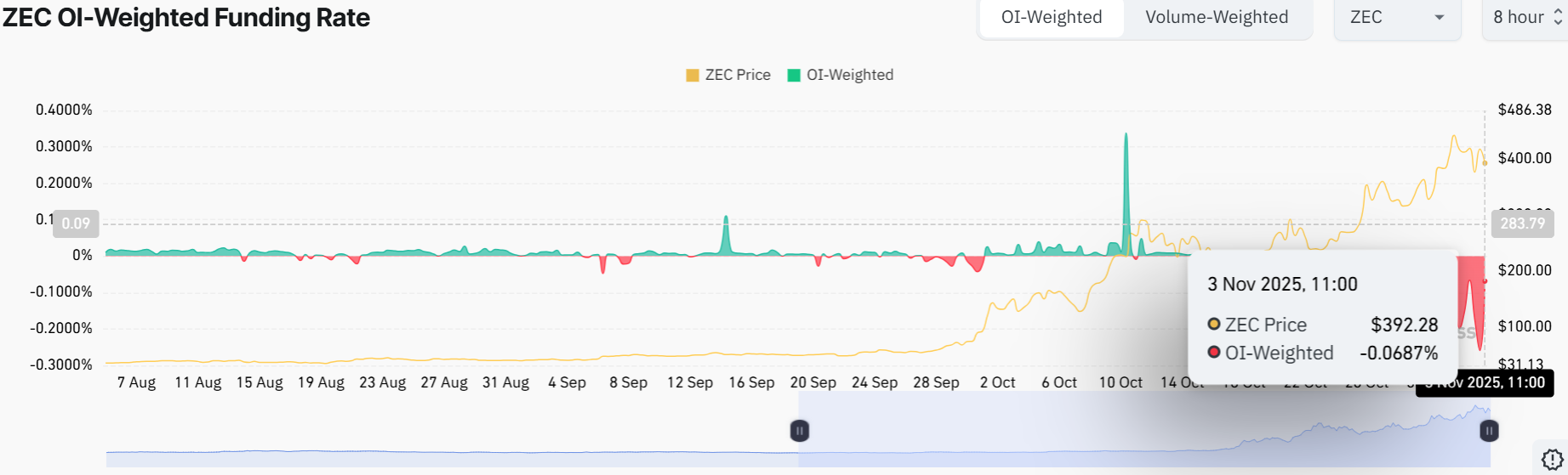 On the other hand, the OI-weighted funding rate has been negative even though the Zcash price has been trading at or close to its all-time high of $449 as of Saturday. The negative funding rates suggest traders are de-risking at the moment. Moreover, this suggests bullish exhaustion with the OI-weighted funding rate at -0.0687%. Additional shortening of position is also likely to cause additional selling pressure.