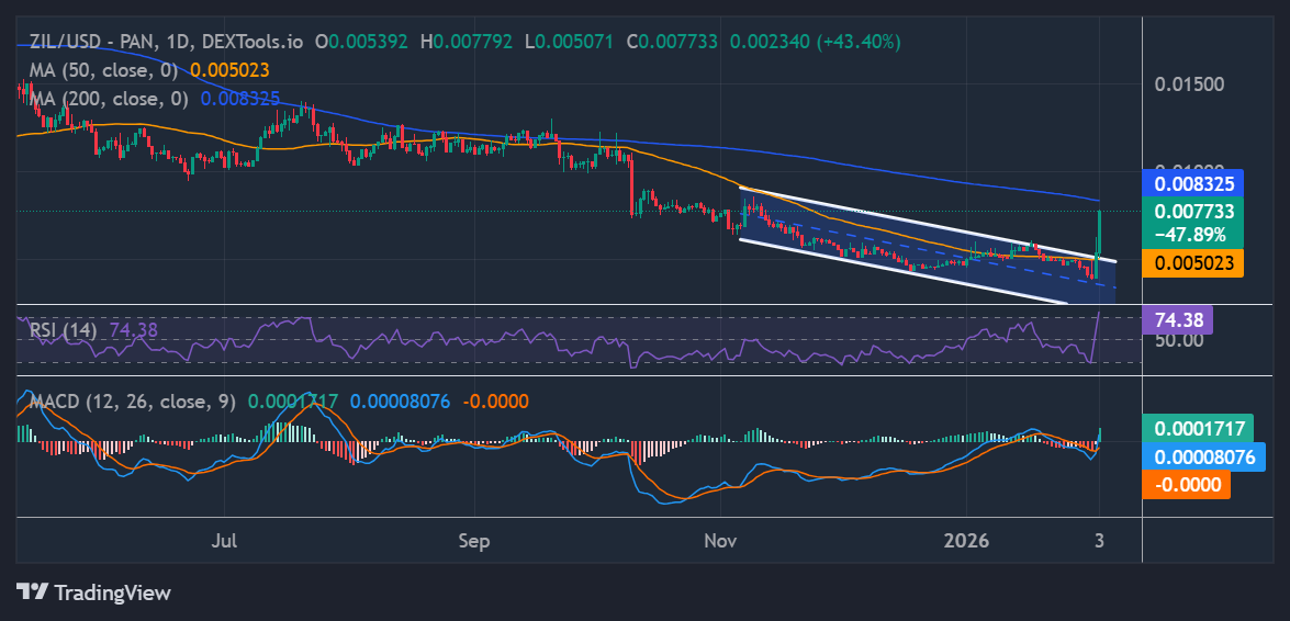 The momentum indicators agree with the bullish picture painted in the ZIL market. The Relative Strength Index (RSI) is at 74.38, very overbought territory, which tells us the coin price could face a healthy correction soon. The MACD, however, remains above the signal line, showing that the trend’s momentum is still with the bulls for now. This confirms a robust uptrend, but it’s not at levels usually seen in explosive bull markets, implying that things could balance out soon.
