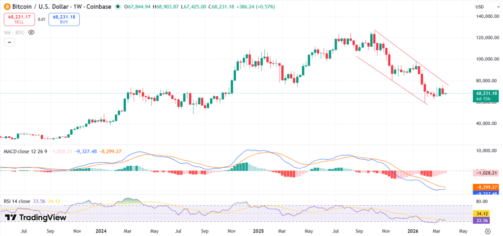 Looking at the technical indicators on the weekly chart, BTC continues to extend its downtrend, forming a descending channel pattern. The recent bullish momentum witnessed last week saw the price nearly test the upper trendline of the pattern, but it retreated after bulls lost momentum.