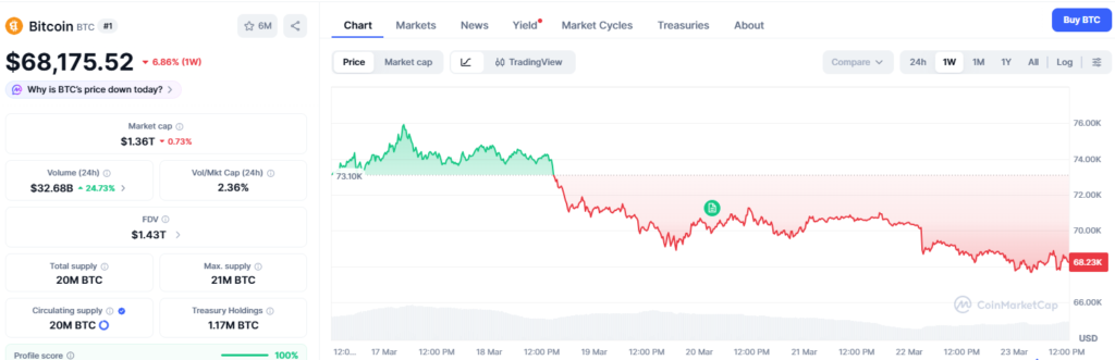 On the weekly chart, BTC declined by more than 6%, erasing all the gains on the monthly chart. At the time of this writing, BTC is trading around $68,175, down by 0.85%. Moreover, its market capitalization and trading volume have dropped to $1.36 trillion and $32 billion, respectively.