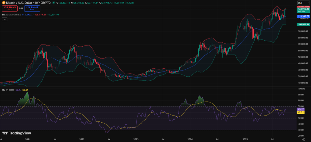 Technical indicators on the weekly chart indicate that BTC is trading on an ascending channel. The price is trading alongside the upper Bollinger Band, which previously acted as a resistance zone. Support for BTC has been noted around the $113,335 region. Furthermore, the RSI is slightly below the overbought region.